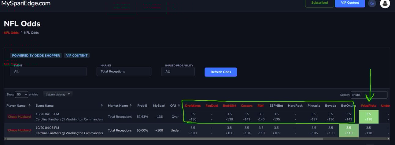 Step 2 - For my research, I wanted to see what the odds were for Chuba Hubbard across all of the sportsbooks so I went to NFL PLAYER ODDS