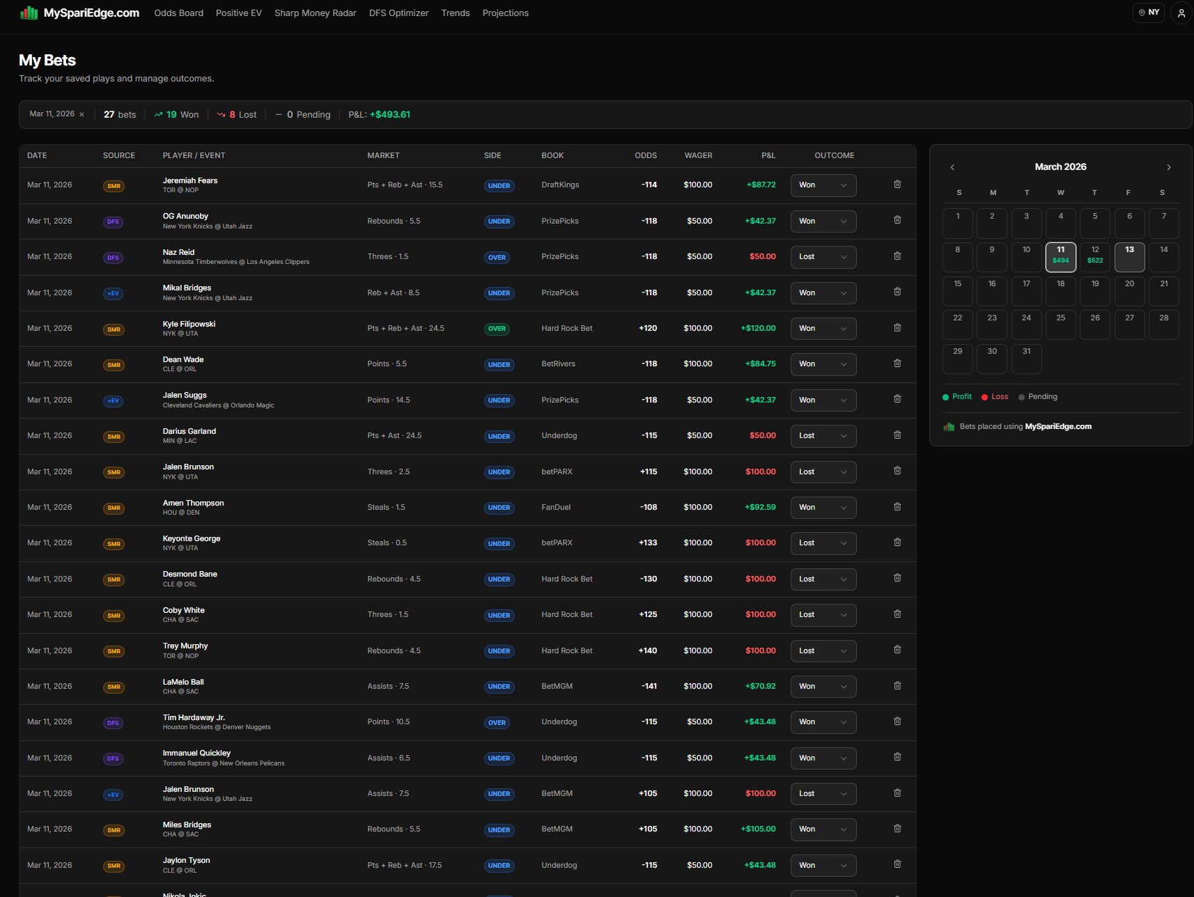 Sharp Edge members can track all of their bets from the +EV Optimizer, Sharp Money Radar, DFS Optimizer, and our Projections.